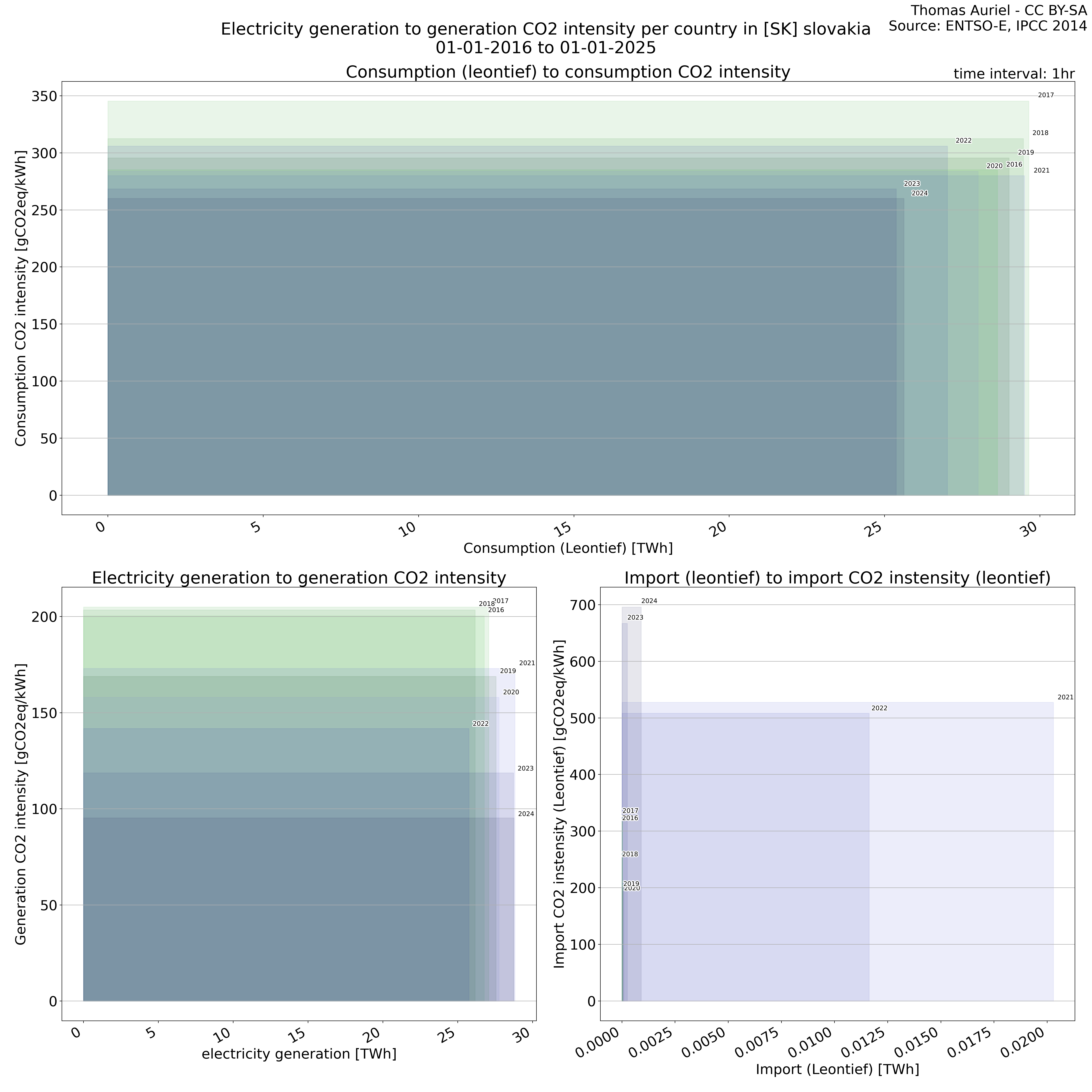 The plot consists of squares, each representing a single year, designed to illustrate electricity-related metrics and their associated environmental impacts. The length of each square corresponds to the total electricity consumption, generation, or imports during the year, with longer squares indicating higher overall values for the respective metric. The height of each square represents the average CO₂ intensity (e.g., grams of CO₂ per kWh) associated with electricity consumption, generation, or imports; hence, taller squares signify greater environmental impact per unit of electricity. Finally, the surface area of each square, determined by the product of its length and height, represents the total CO₂ emissions associated with the respective activity in the given year.