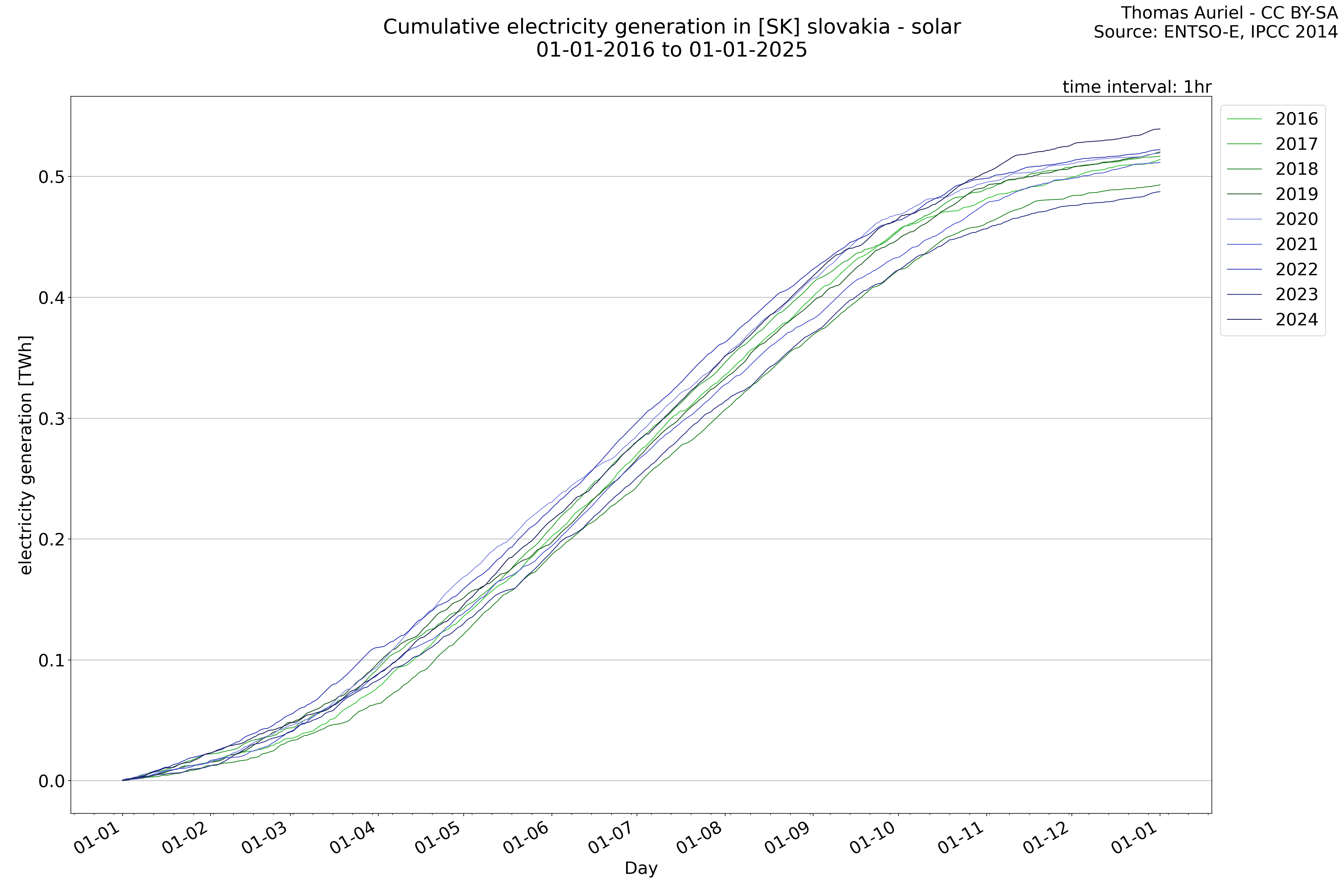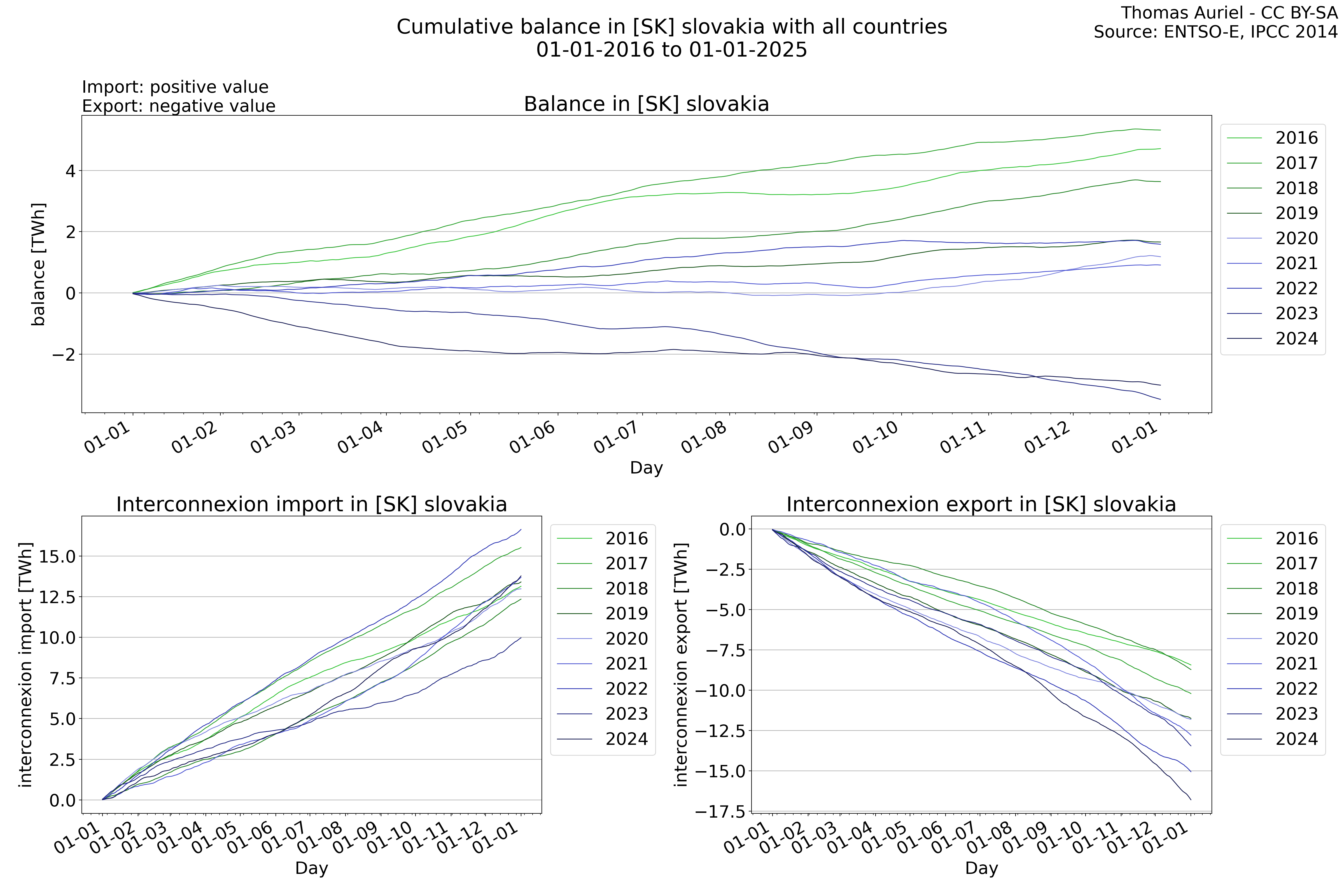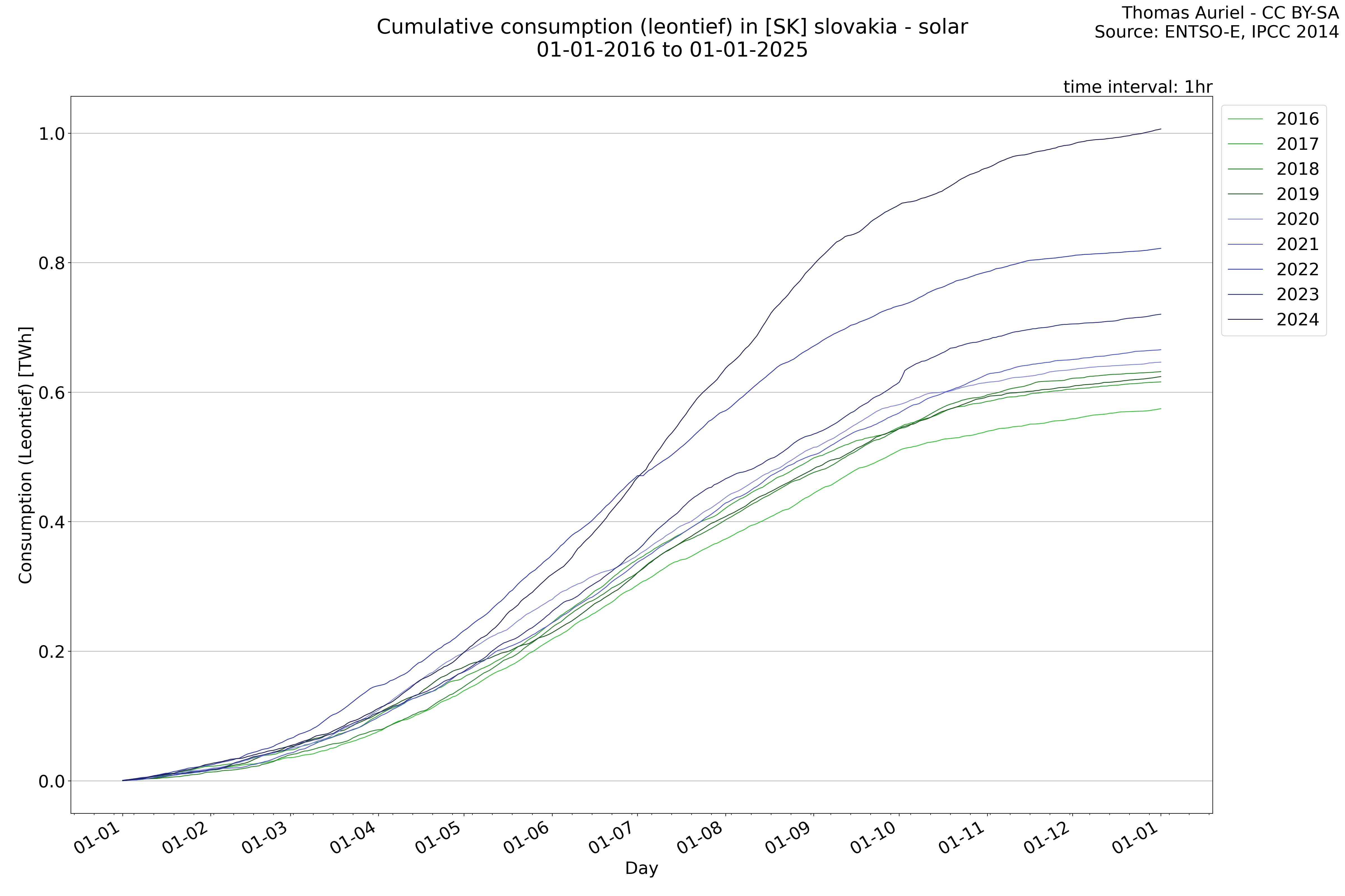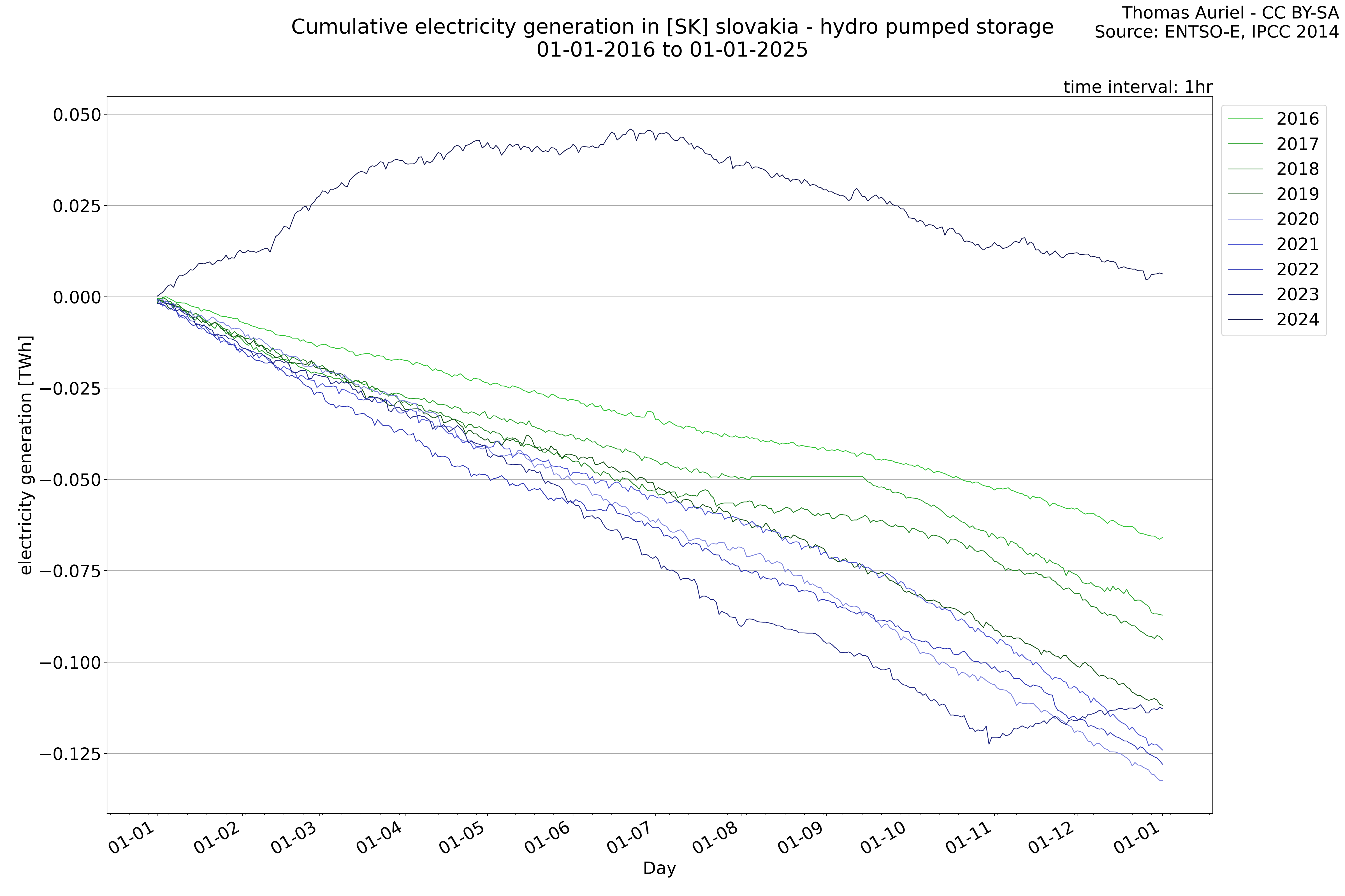 This plot is a cumulative sum plot, where each line represents the cumulative value of a specific metric (e.g., production, load, import, or export) for a given year. The plot begins at zero, and as the year progresses, the cumulative value is updated to reflect the total amount accumulated over time. This visualization illustrates the overall trend of the metric, showing whether the cumulative sum is increasing or decreasing, as well as any changes in the trend within the year. Additionally, the cumulative sum plot helps to reduce the impact of noise and short-term fluctuations commonly present in the raw data of production, load, import, or export. By smoothing out these variations, the plot emphasizes the broader, long-term trends. Consequently, this type of visualization facilitates a clearer understanding of the metric’s evolution across the year, revealing whether the activity follows a steady trajectory, shows signs of volatility, or experiences periods of significant change.