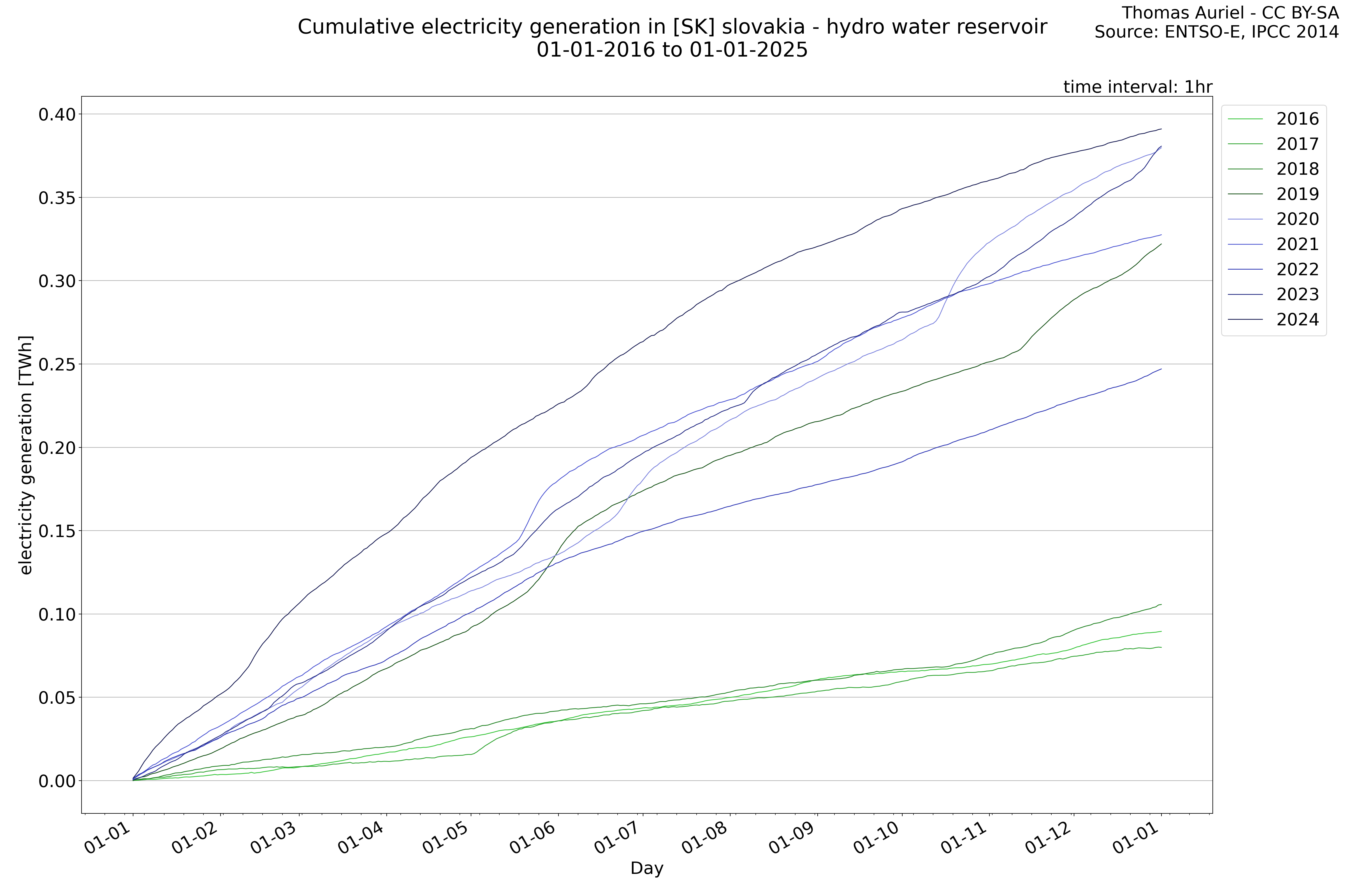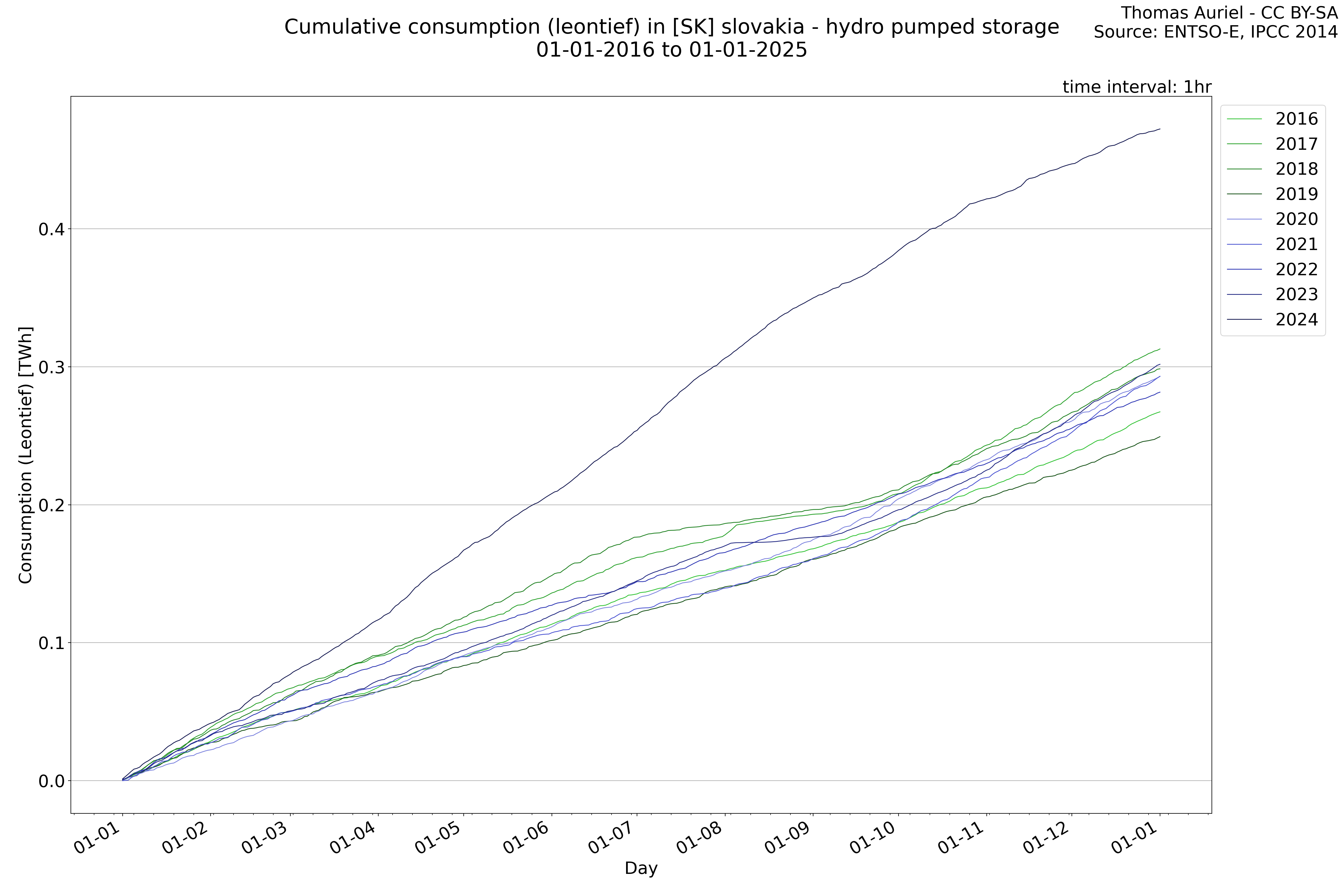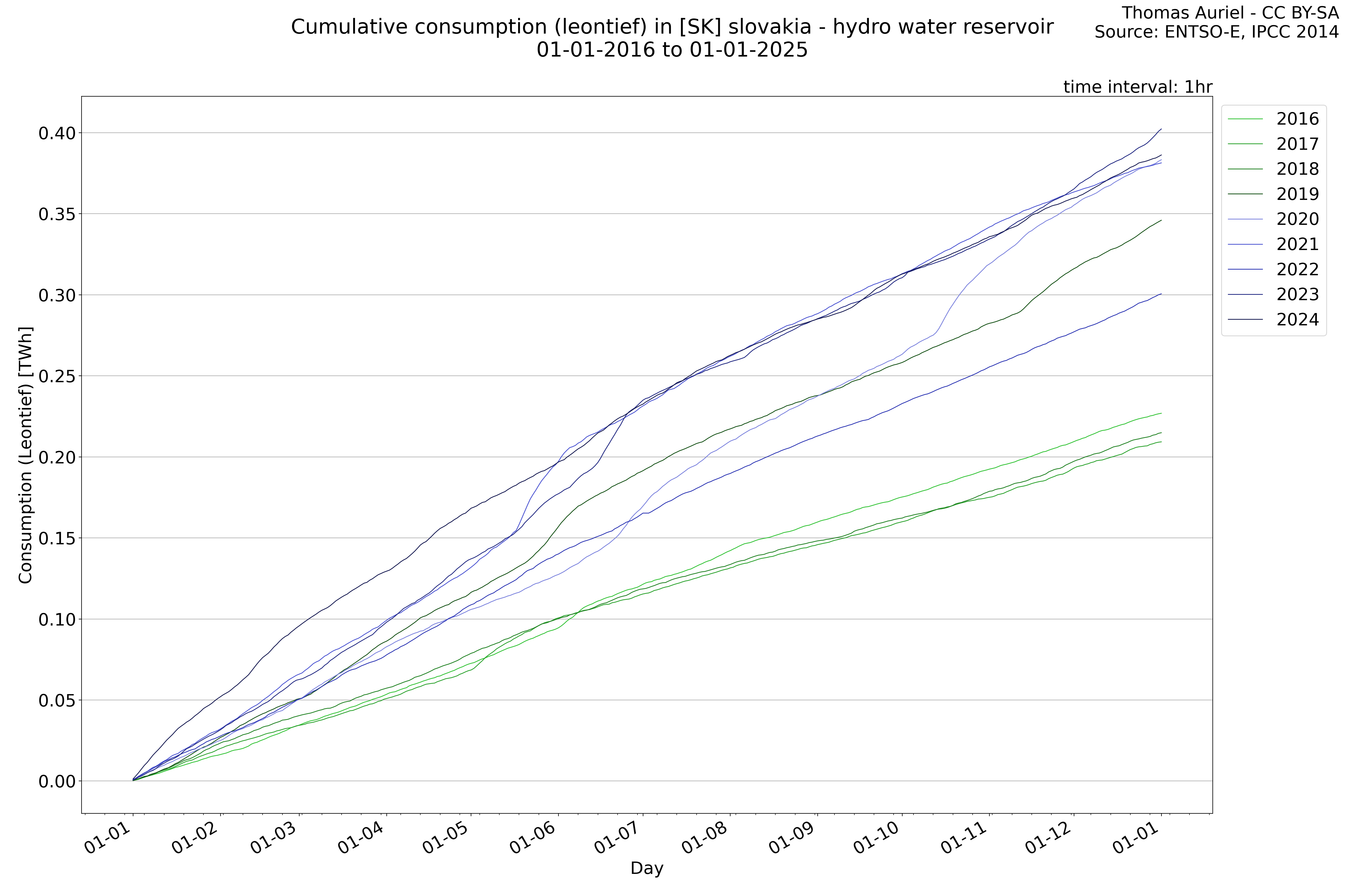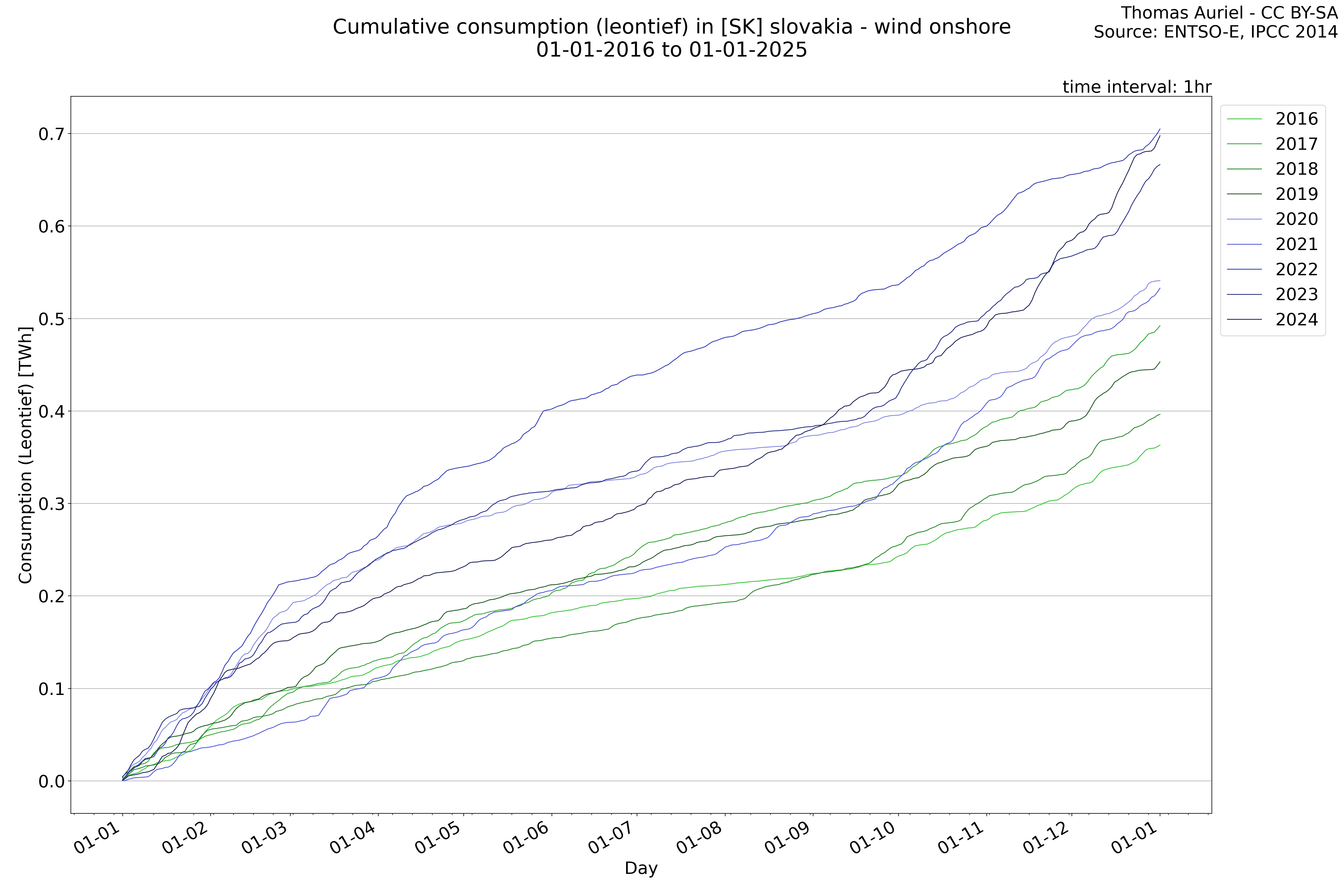 This plot is a cumulative sum plot, where each line represents the cumulative value of a specific metric (e.g., production, load, import, or export) for a given year. The plot begins at zero, and as the year progresses, the cumulative value is updated to reflect the total amount accumulated over time. This visualization illustrates the overall trend of the metric, showing whether the cumulative sum is increasing or decreasing, as well as any changes in the trend within the year. Additionally, the cumulative sum plot helps to reduce the impact of noise and short-term fluctuations commonly present in the raw data of production, load, import, or export. By smoothing out these variations, the plot emphasizes the broader, long-term trends. Consequently, this type of visualization facilitates a clearer understanding of the metric’s evolution across the year, revealing whether the activity follows a steady trajectory, shows signs of volatility, or experiences periods of significant change.