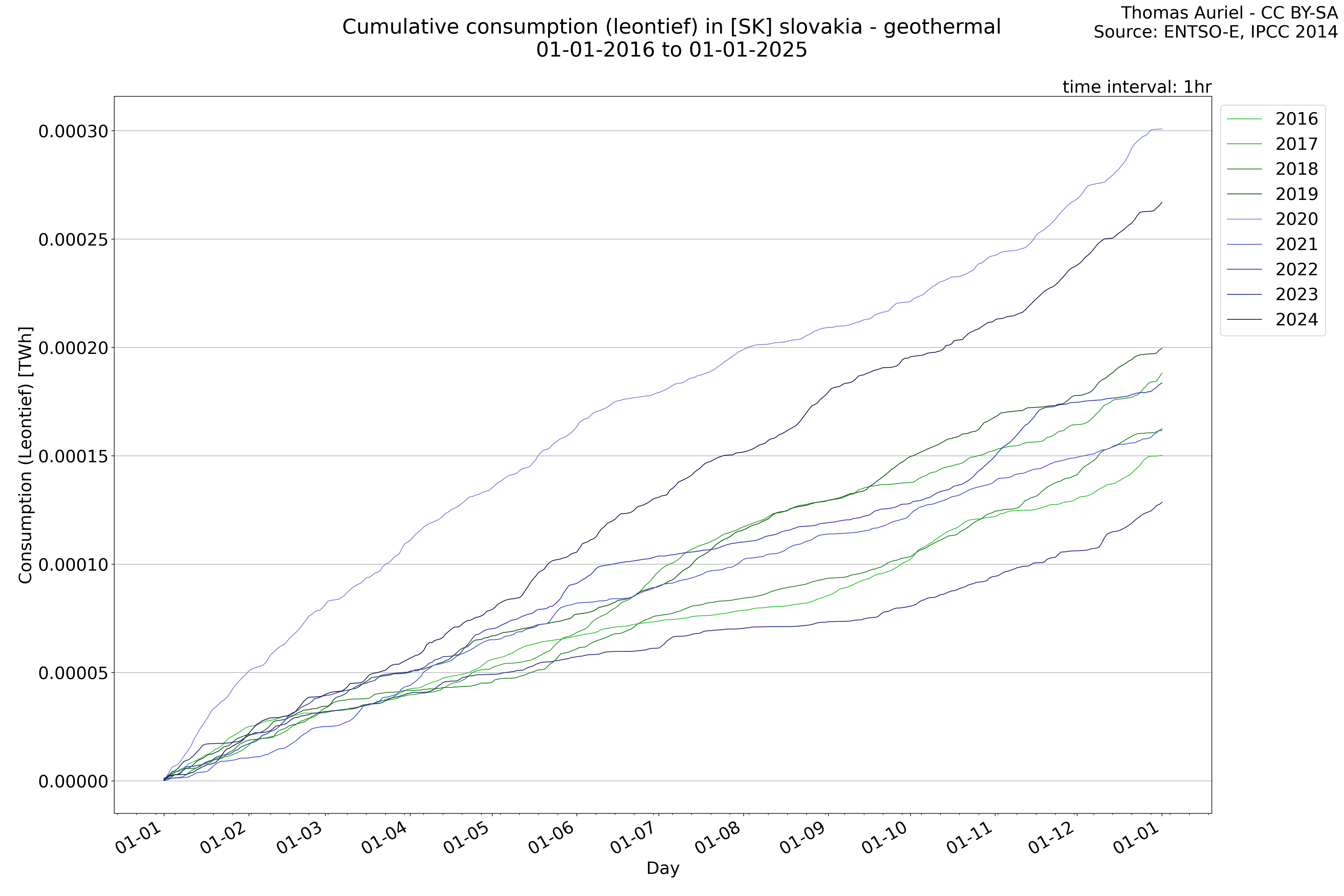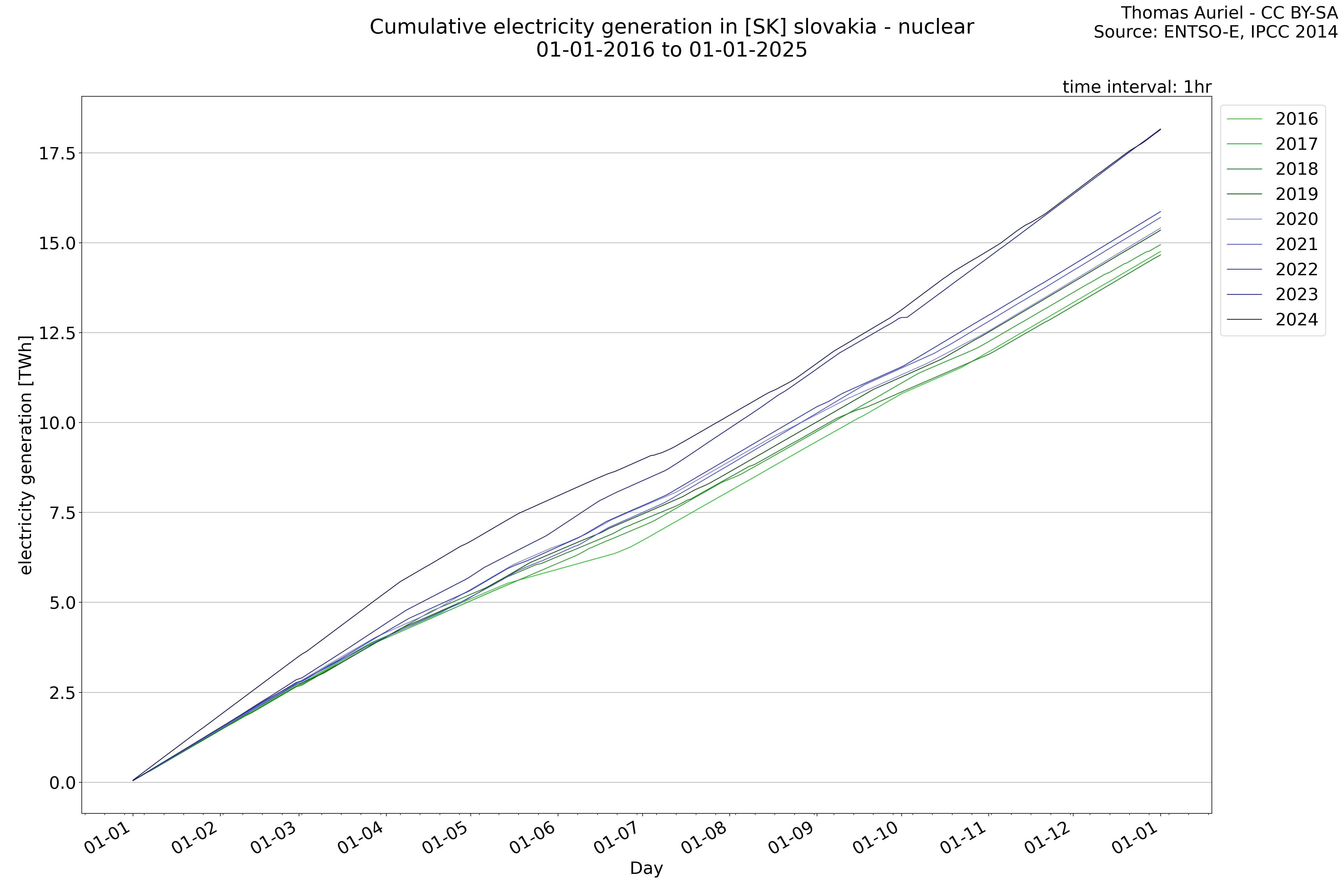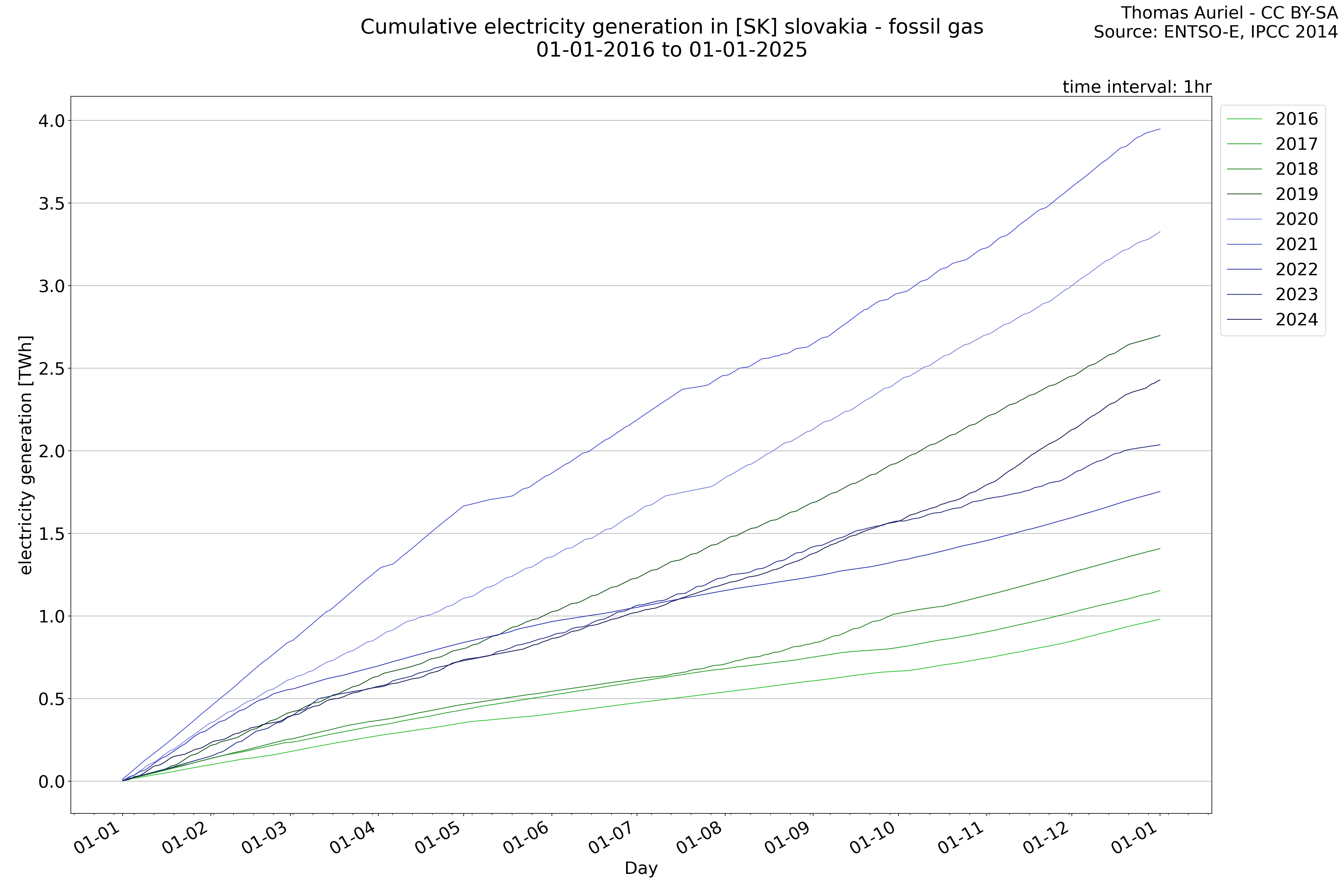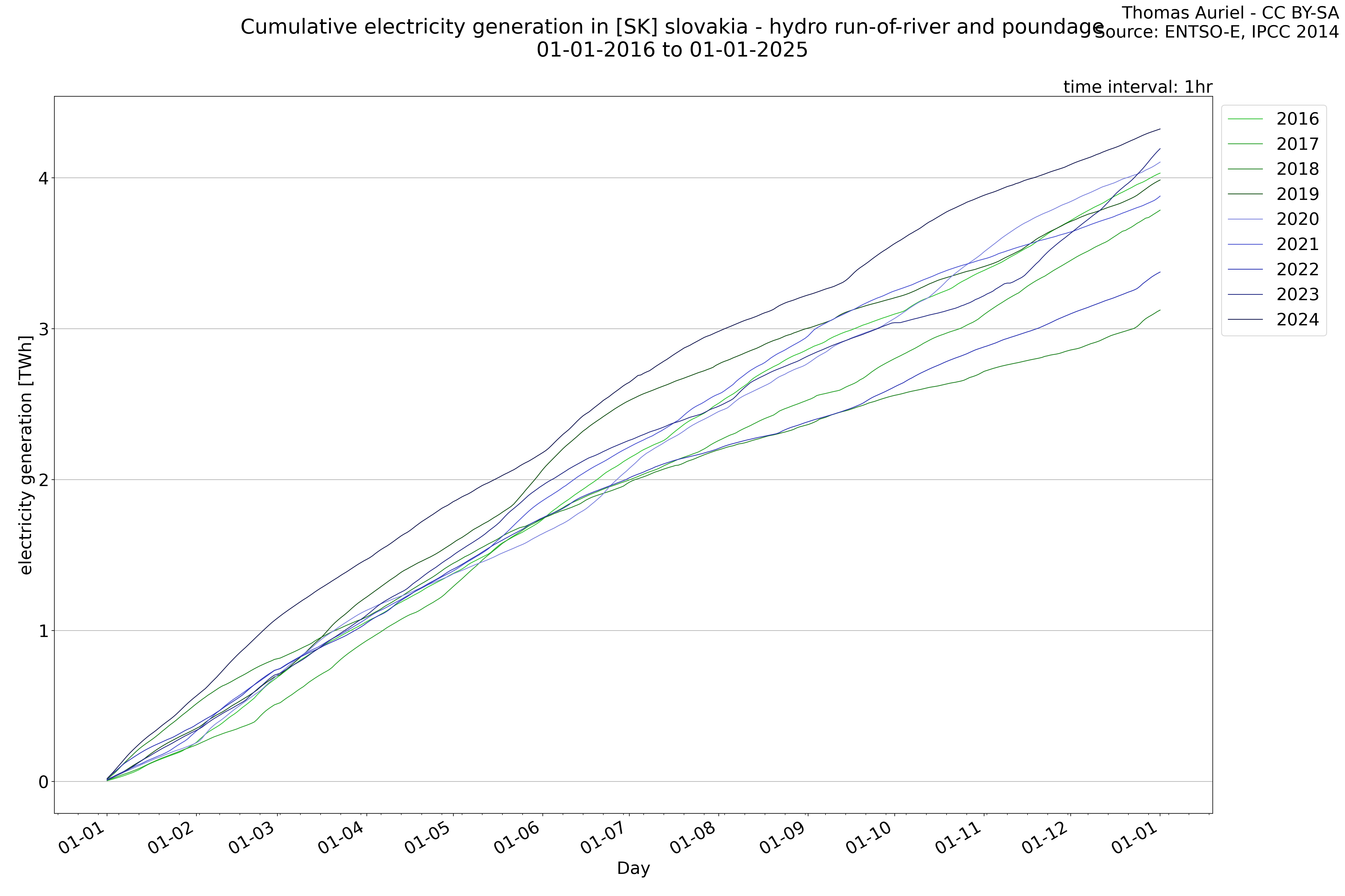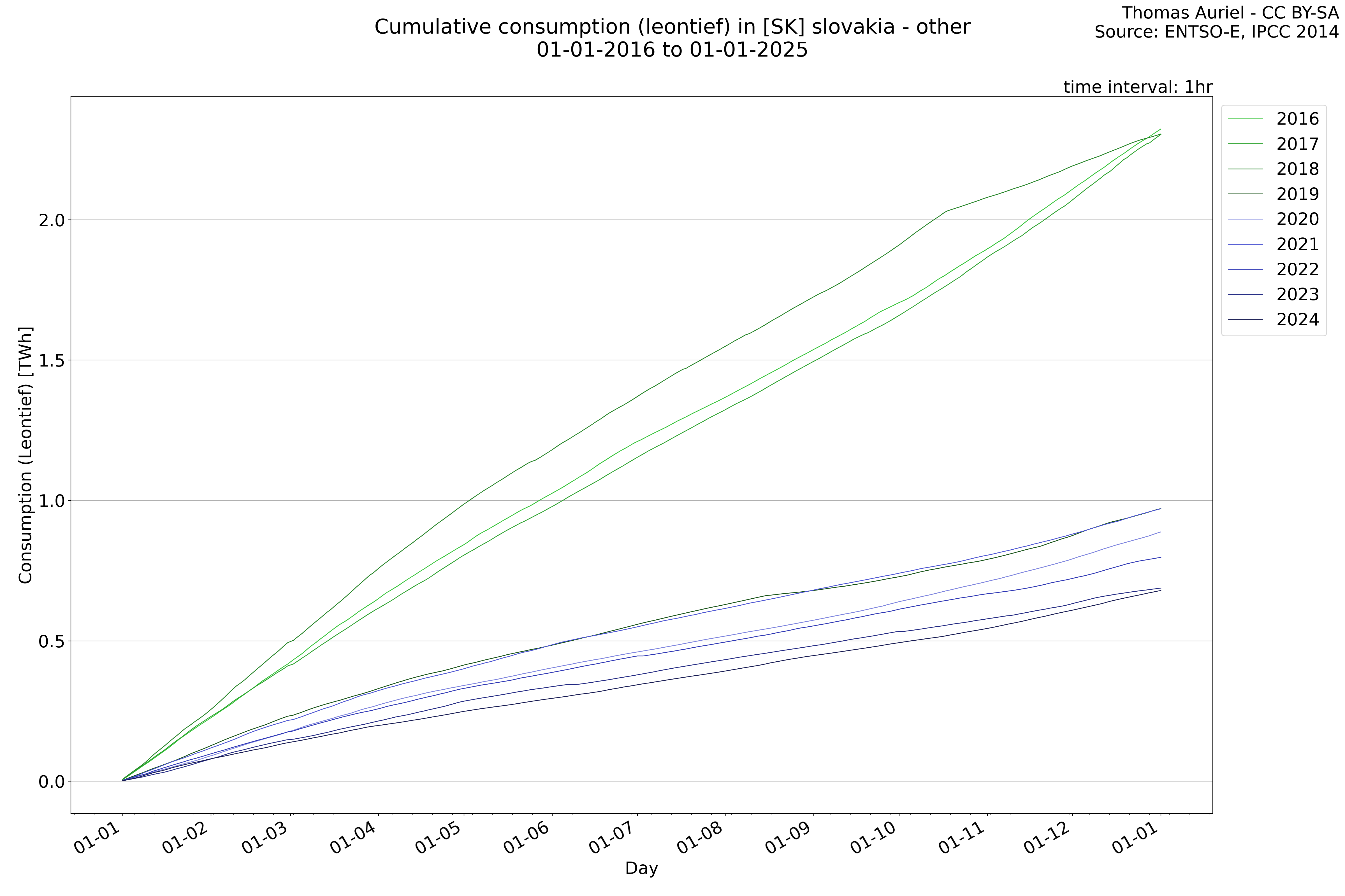 This plot is a cumulative sum plot, where each line represents the cumulative value of a specific metric (e.g., production, load, import, or export) for a given year. The plot begins at zero, and as the year progresses, the cumulative value is updated to reflect the total amount accumulated over time. This visualization illustrates the overall trend of the metric, showing whether the cumulative sum is increasing or decreasing, as well as any changes in the trend within the year. Additionally, the cumulative sum plot helps to reduce the impact of noise and short-term fluctuations commonly present in the raw data of production, load, import, or export. By smoothing out these variations, the plot emphasizes the broader, long-term trends. Consequently, this type of visualization facilitates a clearer understanding of the metric’s evolution across the year, revealing whether the activity follows a steady trajectory, shows signs of volatility, or experiences periods of significant change.