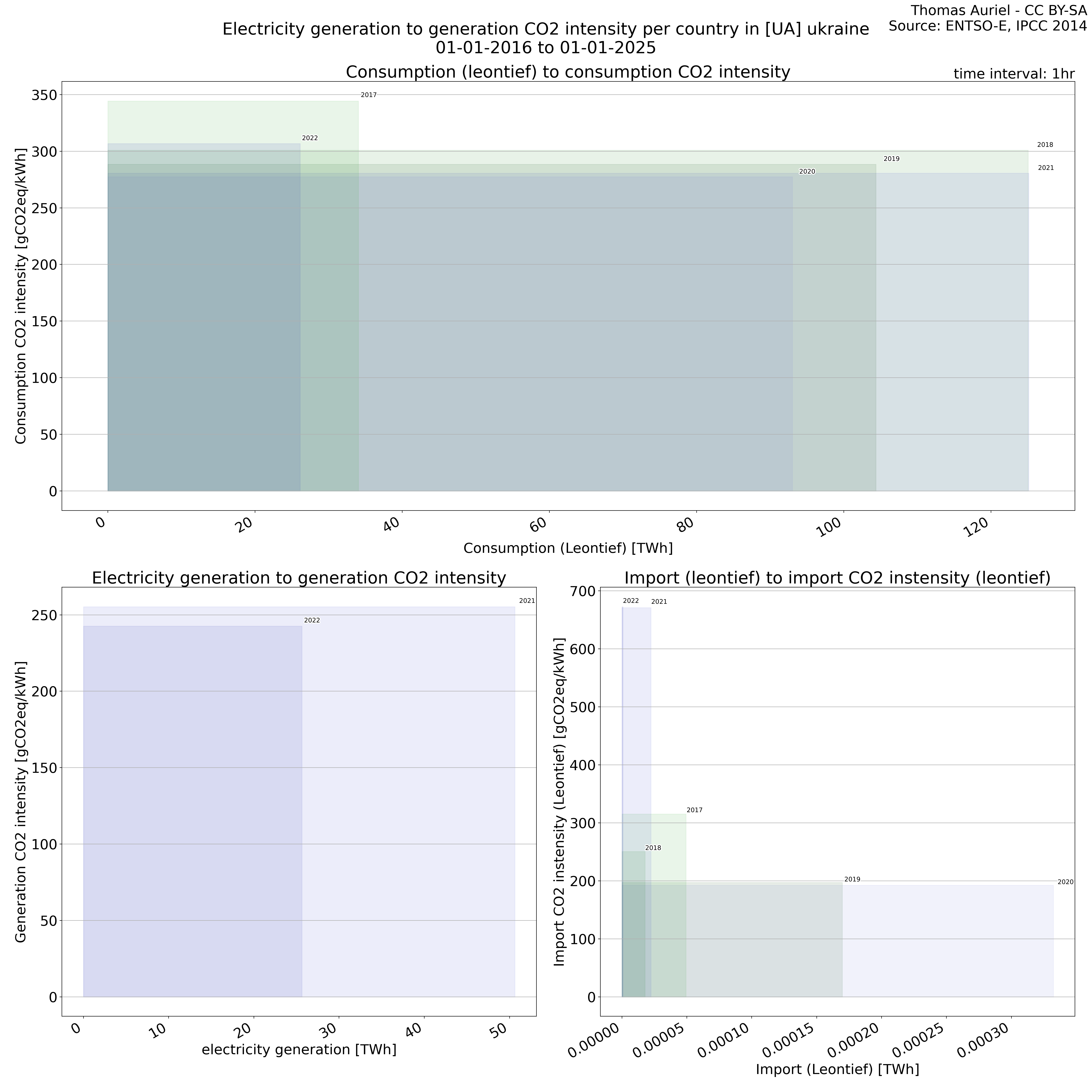 The plot consists of squares, each representing a single year, designed to illustrate electricity-related metrics and their associated environmental impacts. The length of each square corresponds to the total electricity consumption, generation, or imports during the year, with longer squares indicating higher overall values for the respective metric. The height of each square represents the average CO₂ intensity (e.g., grams of CO₂ per kWh) associated with electricity consumption, generation, or imports; hence, taller squares signify greater environmental impact per unit of electricity. Finally, the surface area of each square, determined by the product of its length and height, represents the total CO₂ emissions associated with the respective activity in the given year.