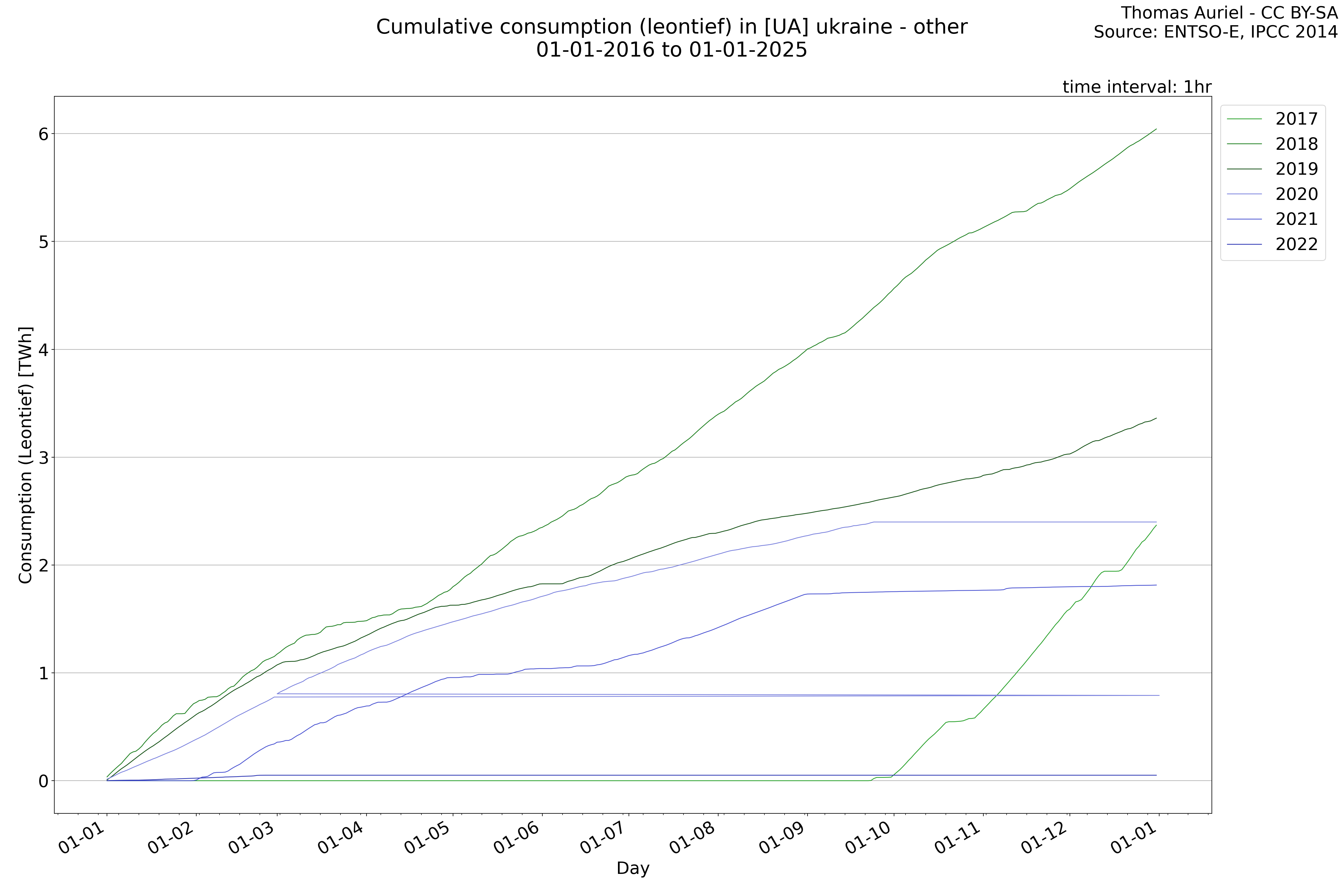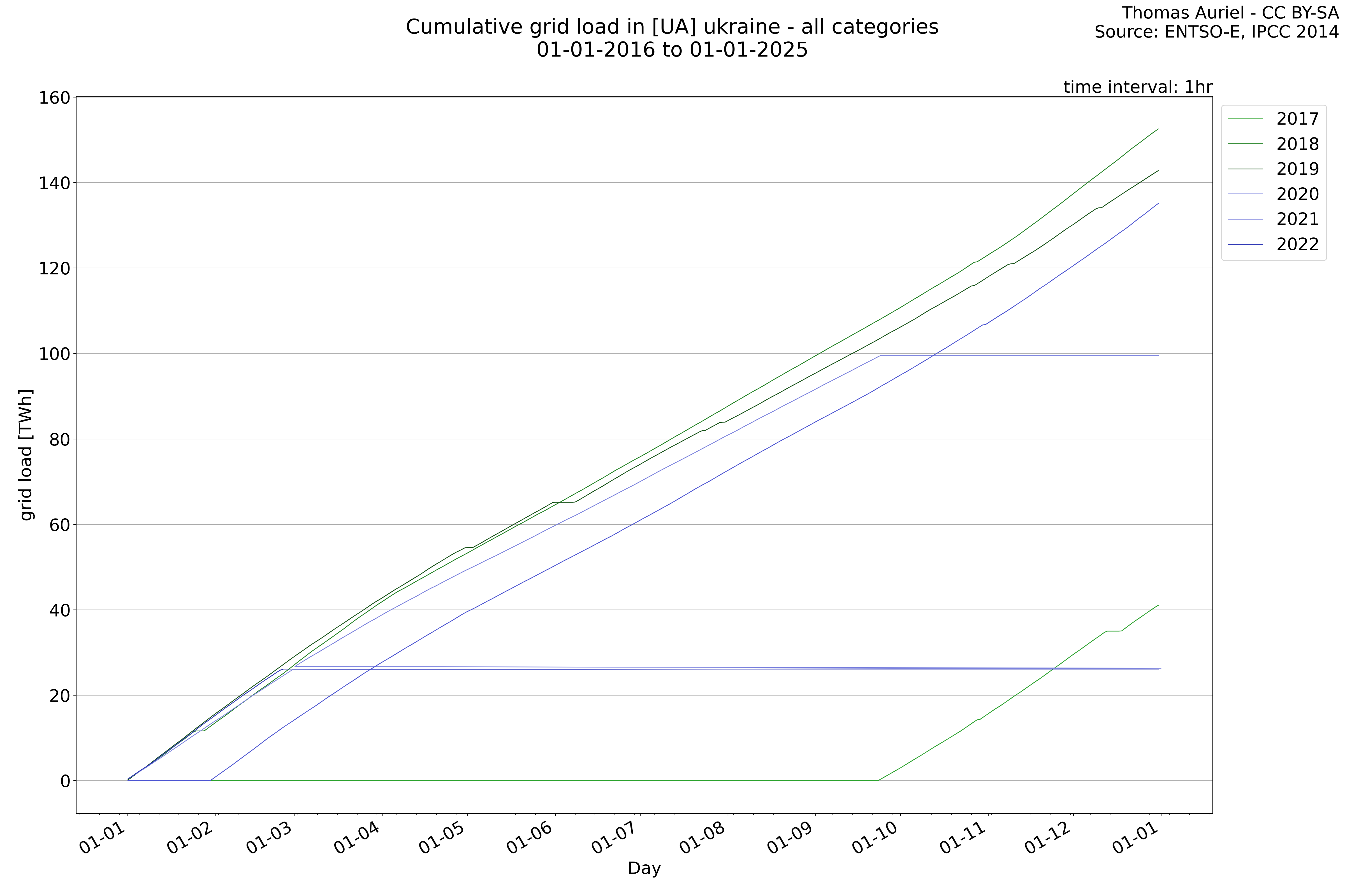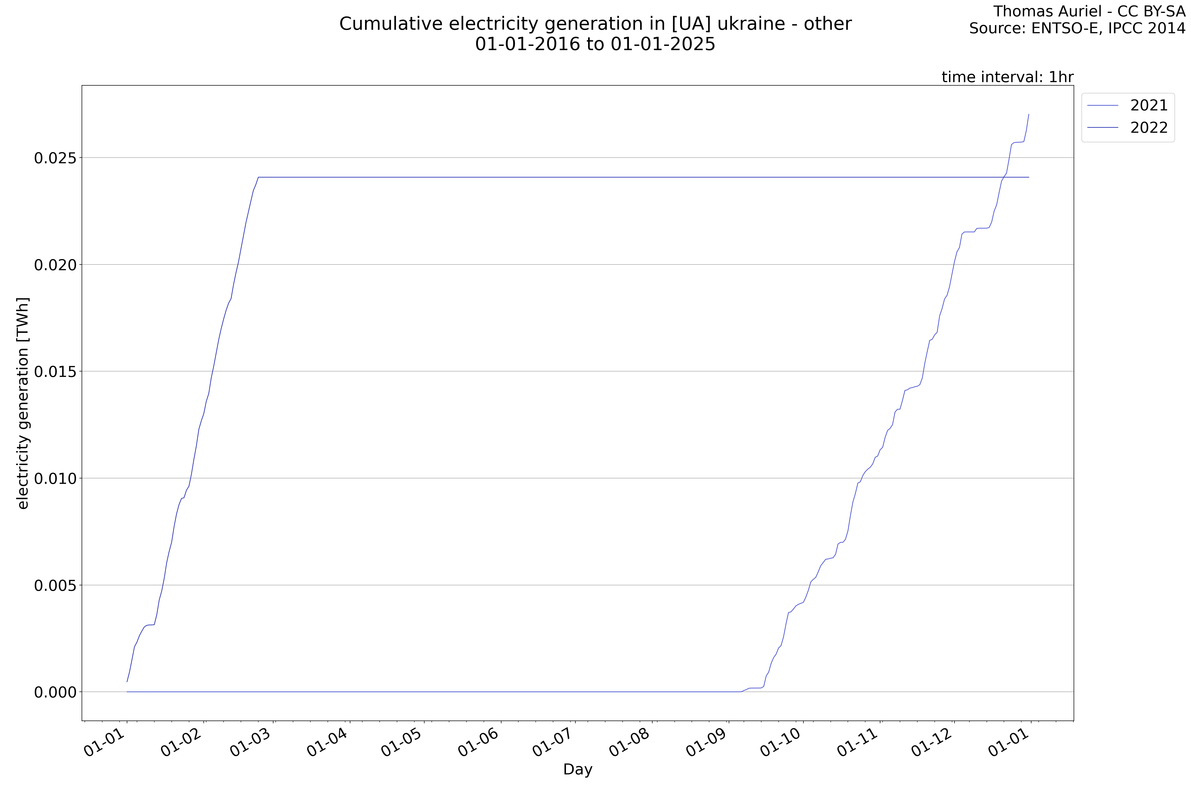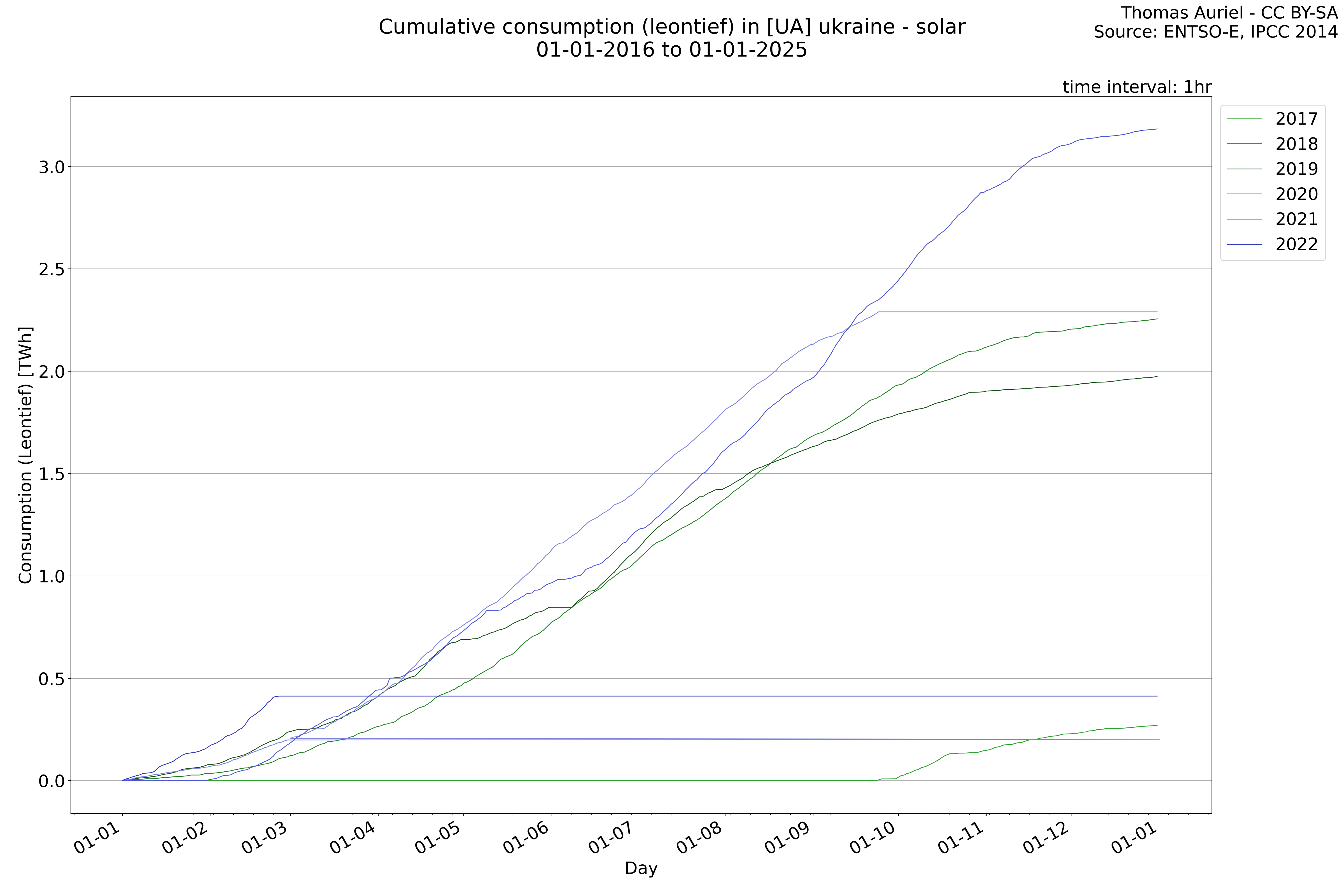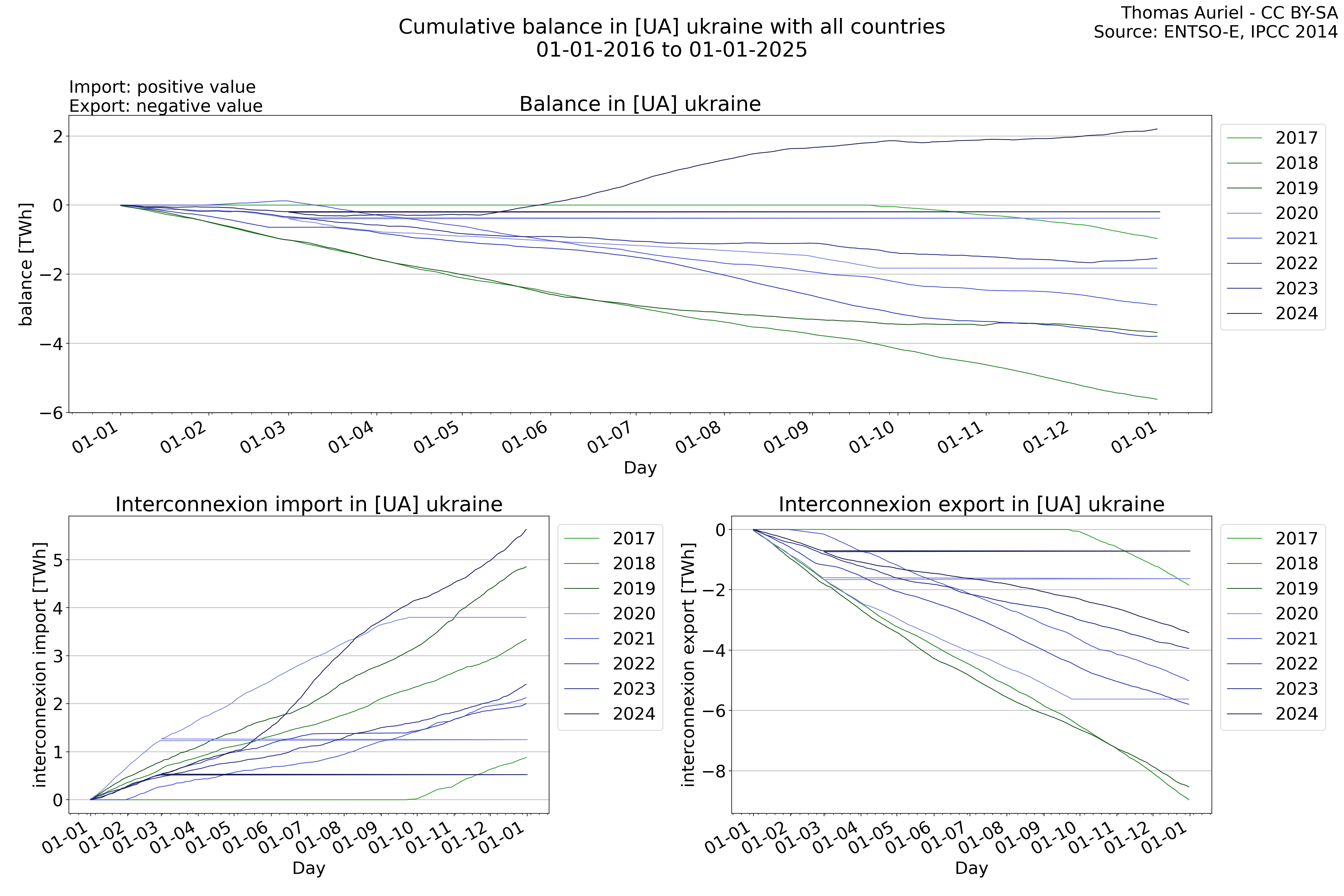 This plot is a cumulative sum plot, where each line represents the cumulative value of a specific metric (e.g., production, load, import, or export) for a given year. The plot begins at zero, and as the year progresses, the cumulative value is updated to reflect the total amount accumulated over time. This visualization illustrates the overall trend of the metric, showing whether the cumulative sum is increasing or decreasing, as well as any changes in the trend within the year. Additionally, the cumulative sum plot helps to reduce the impact of noise and short-term fluctuations commonly present in the raw data of production, load, import, or export. By smoothing out these variations, the plot emphasizes the broader, long-term trends. Consequently, this type of visualization facilitates a clearer understanding of the metric’s evolution across the year, revealing whether the activity follows a steady trajectory, shows signs of volatility, or experiences periods of significant change.
