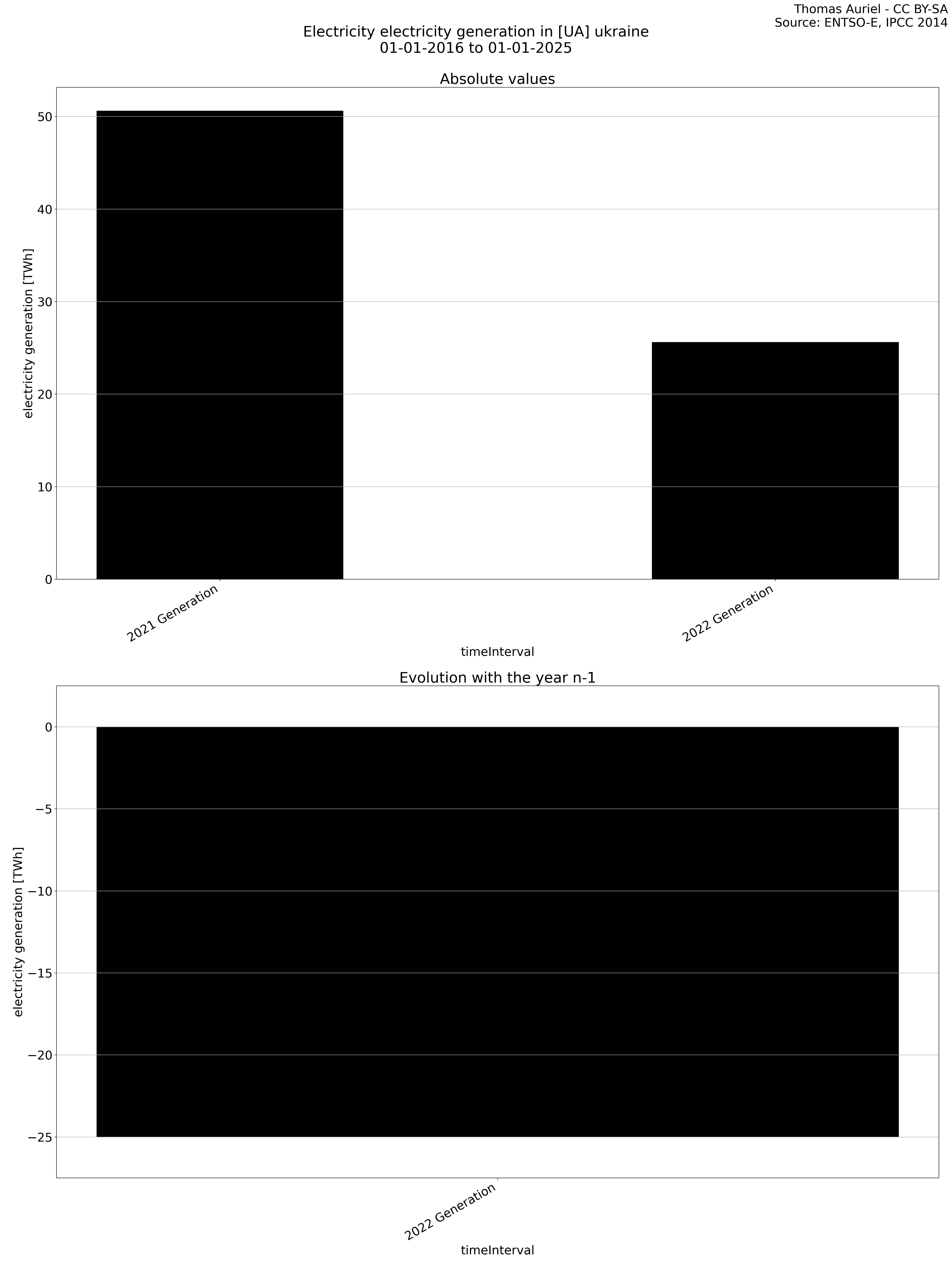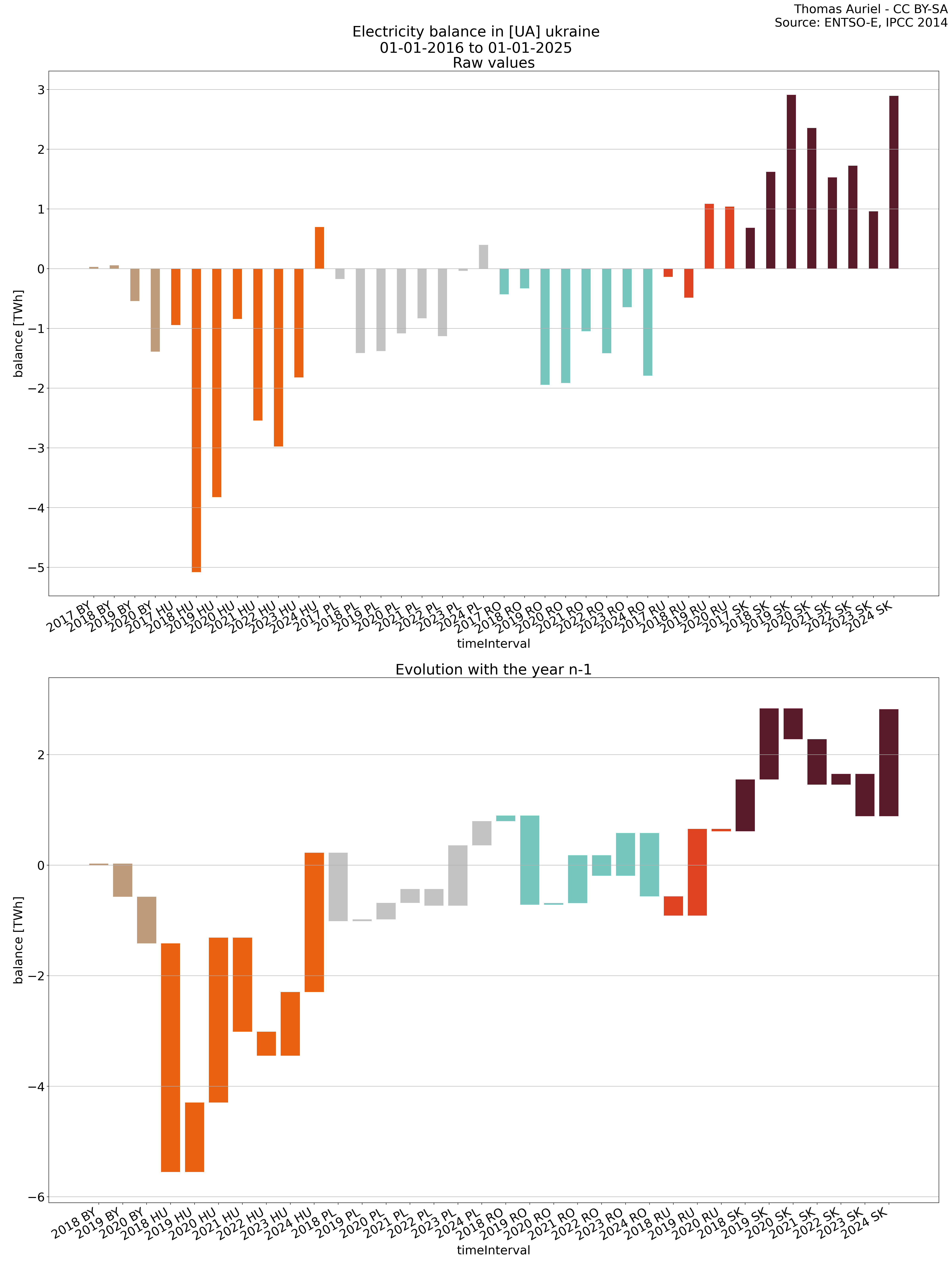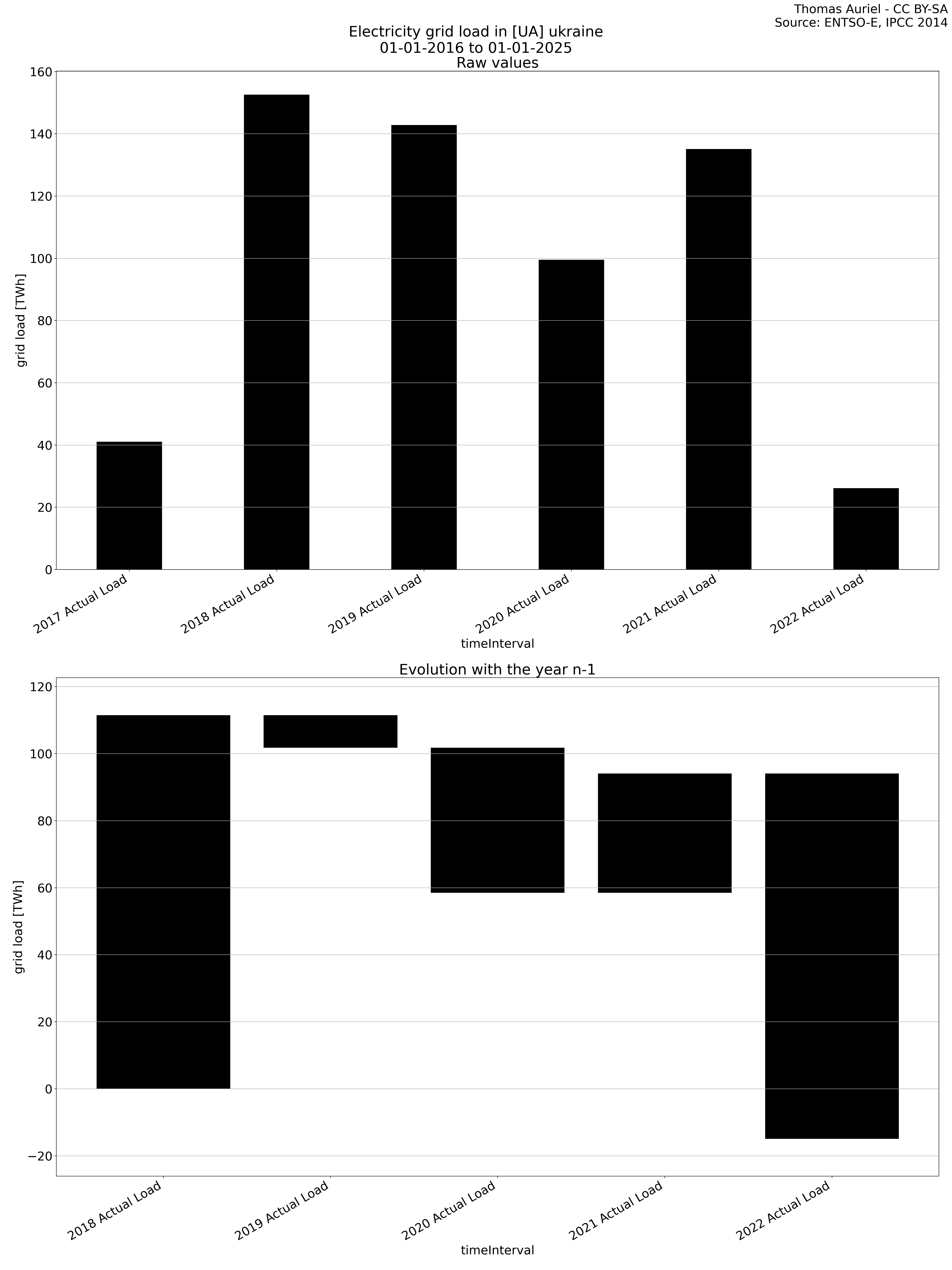 The second section features a waterfall graph, which visually represents the year-over-year changes in electricity metrics. In this graph, the length of each bar corresponds to the difference in the metric (e.g., production, load, etc.) compared to the previous year. Unlike the bar plot, the bars in the waterfall graph do not start at zero; instead, each bar begins where the previous one ended. Hence, this structure emphasizes the incremental changes in the metric over time, facilitating the visualization of fluctuations from one year to the next.